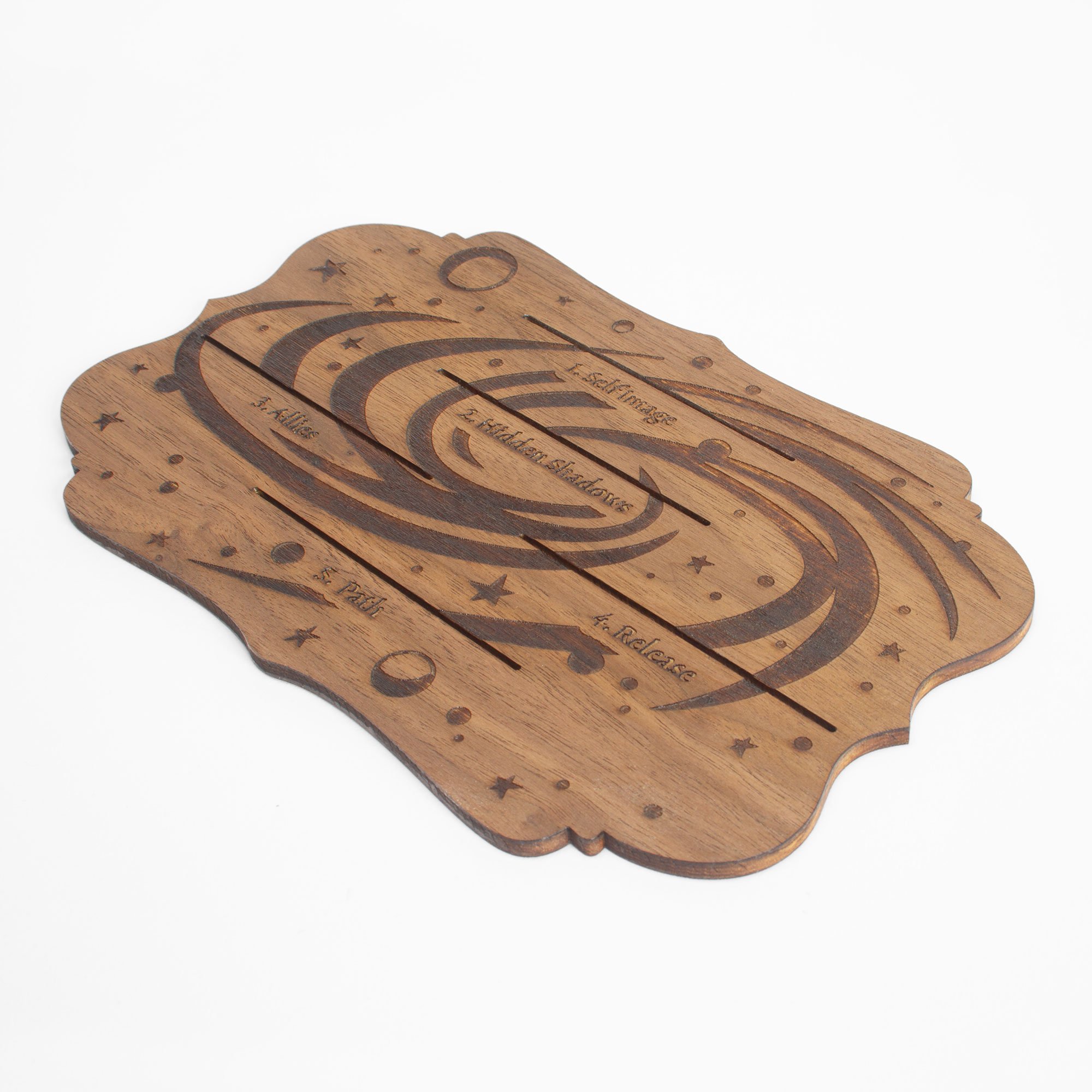 Each board is laser-engraved with a swirling galaxy design and labeled card positions to guide your readings: